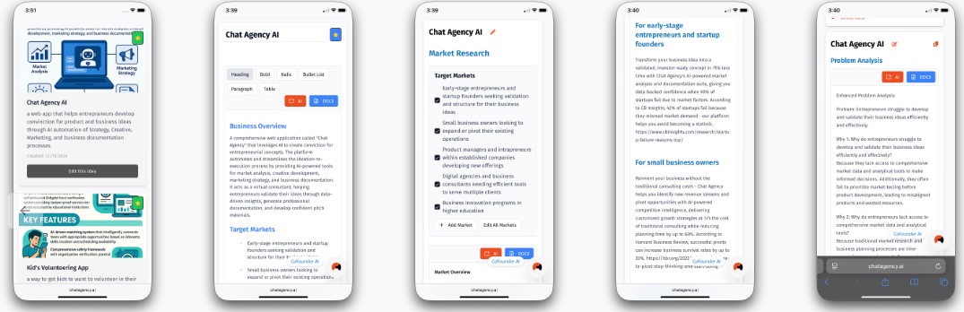 Chat Agency AI functions as a fully integrated online resource tailored to act as a virtual consultant for entrepreneurs, small business proprietors, and intrapreneurs, guiding them from initial ideas to actual implementation by utilizing AI-enhanced workflows. Users kick off their journey by entering concepts related to their business, products, or features, after which the platform supports validation through comprehensive modules that address market research, competitive analysis, value propositions, user personas, user stories, product visions, elevator pitches, financial summaries, and other critical components. Additionally, it facilitates the generation of essential business documents, including a Business Requirements Document (BRD), pitch decks, and executive summaries, along with options for exporting in .docx format. The user-friendly dashboard allows for seamless management of multiple concepts, enabling team collaboration, sharing of ideas, and organization of all tasks in one central hub. By simplifying the process and reducing what usually spans several months into just minutes, the platform effectively tackles the prevalent issue of "idea inertia," boosting both productivity and creativity. This empowers entrepreneurs to concentrate on perfecting their vision while skillfully navigating the challenges associated with launching and operating a business. Ultimately, Chat Agency AI not only enhances efficiency but also fosters a more innovative approach to entrepreneurship.
