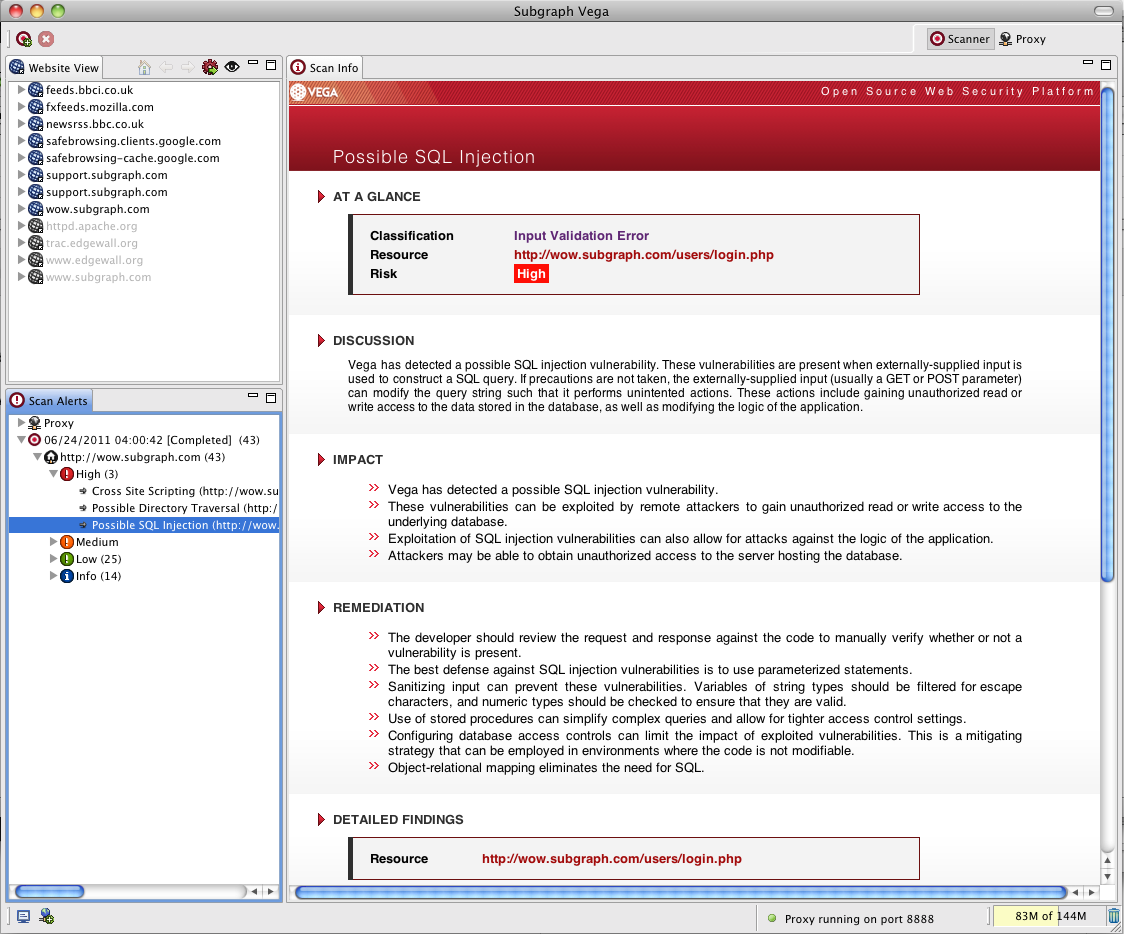 Vega is an advanced application tailored to help users pinpoint and verify an array of security weaknesses, such as SQL Injection, cross-site scripting, and the unintended disclosure of sensitive information. Built using Java, it offers a user-friendly graphical interface and operates seamlessly across Linux, OS X, and Windows systems. This tool enables the detection of various vulnerabilities including reflected and stored cross-site scripting, blind SQL injection, remote file inclusion, and shell injection, among others. Furthermore, it evaluates the security settings of TLS/SSL and proposes improvements to bolster the security of TLS servers. With its automated scanning feature, Vega streamlines the testing process, while its intercepting proxy allows for thorough analysis. The application's scanning abilities are particularly effective in revealing SQL injection flaws and beyond. Additionally, it includes a website crawler that enhances its automated scanning capabilities and possesses the functionality to log into websites automatically when provided with the appropriate user credentials. In summary, Vega stands out as an essential tool for fortifying the security of web applications, making it indispensable for developers and security professionals alike.