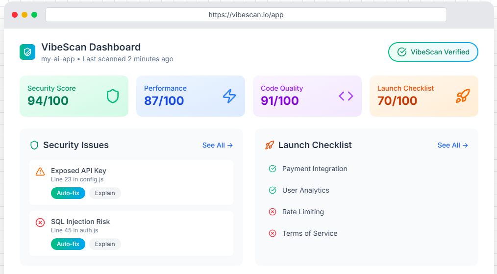 VibeScan is a cutting-edge platform that harnesses the power of artificial intelligence to analyze and correct code, providing developers and teams the confidence to utilize AI-generated code by automatically detecting and resolving issues that may be overlooked in manual reviews. Users can effortlessly upload their code, whether it originates from conventional programming practices or AI-based tools such as OpenAI, Claude, GitHub Copilot, or Cursor, while VibeScan performs a thorough evaluation to pinpoint security vulnerabilities (including exposed API keys and SQL injection risks), performance bottlenecks, coding quality concerns (like code duplication and structural flaws), and overall deployment readiness (which includes assessments of payment processing, analytics, rate limiting, and privacy policies). The outcomes are presented in an intuitive dashboard that showcases scores and offers one-click auto-fixes to streamline the correction process for users. Furthermore, VibeScan supports large codebases, capable of scanning up to 500,000 lines, and integrates smoothly with popular repositories and project management applications. By doing so, VibeScan proves to be an indispensable tool for teams striving to optimize their development processes and uphold superior code quality standards, ultimately leading to more reliable software releases. Enhancing both security and performance, it represents a significant advancement in the realm of software development tools.