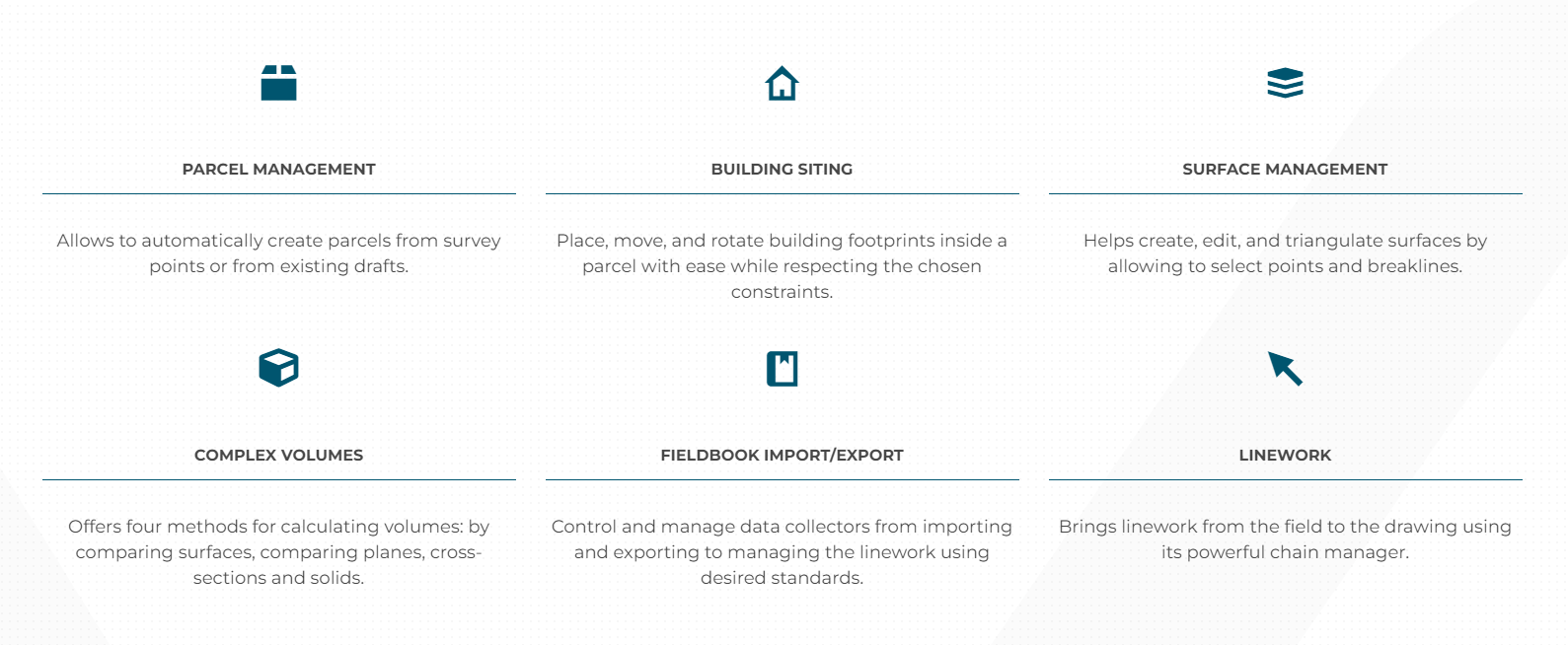 Effortlessly collaborate with your team using your CAD software platform to share data seamlessly. Validate your results to improve the precision of your proofs and produce faster, more accurate drawings based on field data. The software automatically generates parcels using survey points or existing drafts, while allowing you to easily position, adjust, and rotate building footprints within a parcel, all while respecting predefined constraints. The tool simplifies the creation, alteration, and triangulation of surfaces by enabling users to select points and breaklines conveniently. It offers four unique volume calculation methods: surface comparison, plane analysis, cross-section evaluation, and solid processing. You can manage data collectors effectively, overseeing everything from the import and export process to arranging linework according to your specific standards. The system also facilitates the smooth transfer of linework from the field to the drawing through its advanced chain manager. This integration not only enhances the workflow but also contributes to a more streamlined and user-friendly experience for the entire team. Ultimately, this functionality supports better project outcomes by ensuring that all team members have access to the most accurate and up-to-date information.