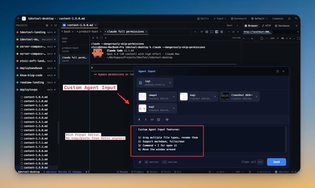 Each terminal session preserves its precise state — including scrollback, ongoing tasks, and agent conversations — so when users restart their machines and come back hours later, they can smoothly pick up right where they left off, saving an estimated 5 minutes with each reboot. This feature not only enhances productivity but also creates a more focused development environment, allowing developers to work without the anxiety of losing their progress. Ultimately, 1DevTool significantly contributes to a more efficient and stress-free development experience.