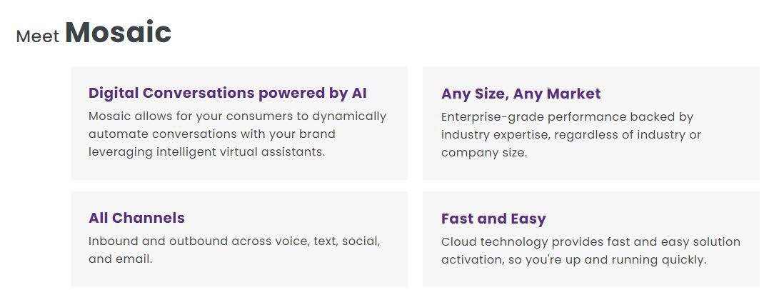 Mosaic enables digital interactions across multiple platforms, whether they are operated by our experts or used independently by clients. Once implemented, it provides universal access to its features. With Mosaic, your customers can effortlessly automate their interactions with your brand through sophisticated virtual assistants. Our robust enterprise capabilities are built on extensive industry expertise, serving businesses of all sizes and across various sectors. Regardless of whether communication is inbound or outbound—via voice, text, social media, or email—our cloud-based solution guarantees quick and easy activation, allowing for a rapid start. Mosaic designs personalized and smooth experiences for your clients whenever they contact you, similar to having your most skilled employee involved in every interaction to handle questions and facilitate transactions. We provide lifecycle managed services using a collaborative and pragmatic approach to ensure Mosaic is delivered effectively. Our dedicated Intrado Success Coaches are instrumental in keeping the software updated with the latest features and controls, while also integrating industry best practices to optimize performance and enhance user satisfaction. This comprehensive assistance not only reinforces the quality of customer engagement provided by Mosaic but also ensures that clients receive continuous support and improvements over time. Ultimately, our commitment to excellence is reflected in every interaction facilitated by Mosaic.