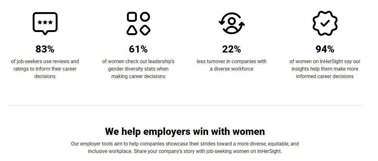 InHerSight empowers organizations to create workplaces that prioritize happiness and gender diversity within their teams. Discover how our suite of resources and insights can position your organization as a leader in diversity, equity, and inclusion efforts. Our comprehensive set of employer tools is crafted to assist businesses in showcasing their advancements in creating a more inclusive and fair work environment. By sharing your organization's story on InHerSight, you can engage with millions of women who are exploring their next career move. Our platform draws a large audience of women, with ninety percent expressing openness to new job opportunities, regardless of whether they are actively seeking them. To boost your recruitment strategies, we ensure your job postings are visible to qualified women who are enthusiastic about joining companies that prioritize diversity. Through our compelling content, targeted email outreach, and vibrant social media engagement, we are excited to highlight the initiatives employers are taking to foster supportive and women-friendly workplace cultures. By collaborating with us, you can showcase your dedication to gender diversity and attract exceptional talent while contributing to a broader movement for equality in the workplace. Let's work together to drive meaningful change and create an environment where everyone can thrive.