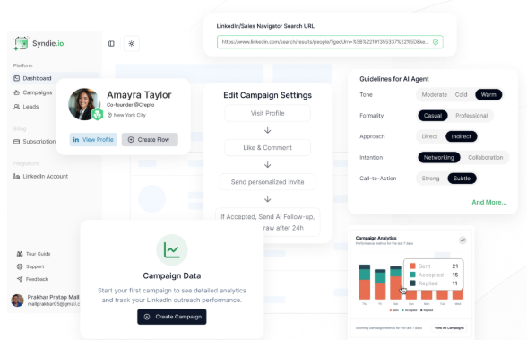 Syndie.io is an advanced automation tool for LinkedIn that utilizes artificial intelligence to enhance personalized outreach efforts effectively. Users can easily import lead lists from both LinkedIn Sales Navigator and standard search results, enabling the creation of customized outreach campaigns. The platform allows users to craft detailed campaign flows through various actions, such as visiting profiles, engaging with posts, sending connection requests, and scheduling follow-up messages, which helps in establishing a well-rounded engagement strategy. By harnessing the power of AI, Syndie.io produces unique messages tailored to individual recipients, ensuring that interactions feel authentic and avoiding generic templates that can hinder relationship-building. Furthermore, the platform features robust management tools that allow users to run several campaigns at once while providing real-time performance metrics through intuitive analytics and visual graphs. By mimicking human-like interactions, the tool guarantees that all engagements remain genuine and adhere to LinkedIn's rules. Ultimately, Syndie.io aims to significantly enhance user engagement, resulting in more replies, increased meeting schedules, and the acquisition of new clients, thus improving overall networking success. This innovative solution stands out as a valuable asset for professionals eager to refine and elevate their outreach techniques, making it a pivotal resource in the realm of digital networking.