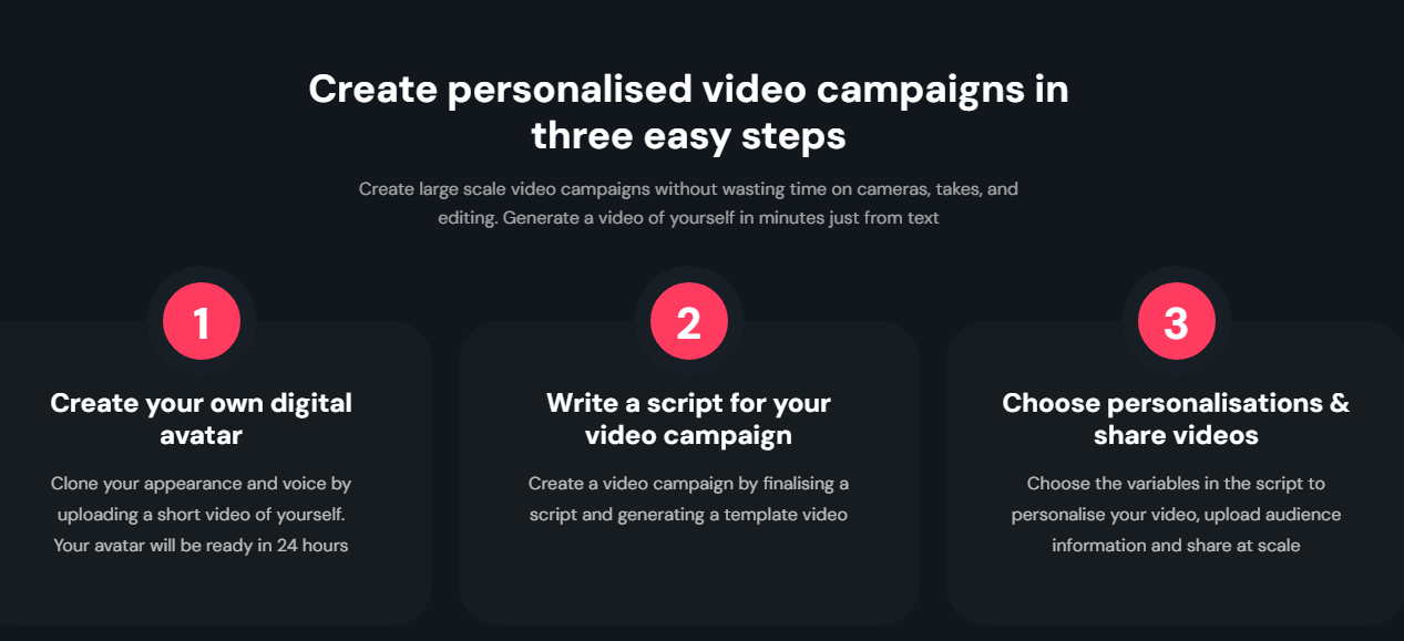 You don't need to recruit a cast, rent studios, or gather cameras to produce a video; instead, you can simply write your script and use our expanding range of digital personalities to convey your message. By copying and pasting your text, you can select an AI-generated voiceover, and your finished video will be ready for download, editing, or translation into various languages. In just a few minutes, you can generate a polished video by utilizing only your script and a bit of creativity. Now, it's your opportunity to produce a high-quality video swiftly. There's no requirement to hire performers, reserve filming locations, or assemble a production team. You can effortlessly craft professional videos in mere moments. This allows you to generate content for a worldwide audience without the necessity of filming in every location. To customize your videos, simply highlight names and companies, linking them to your Customer Management Resources (CMR). Once you're satisfied with your creation, you can automate video production for your entire database using our API. Our current offerings include a variety of backgrounds, personalized backgrounds, and AI text-to-speech capabilities, enabling you to launch mass video personalization campaigns with ease through our API. With such innovative tools at your disposal, the possibilities for creativity and outreach are virtually limitless.