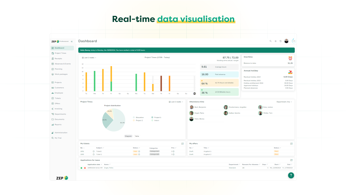• ZEP Professional: This version provides enhanced capabilities for project planning, including revenue and profit analysis, travel expense oversight, and comparisons between planned and actual hours.