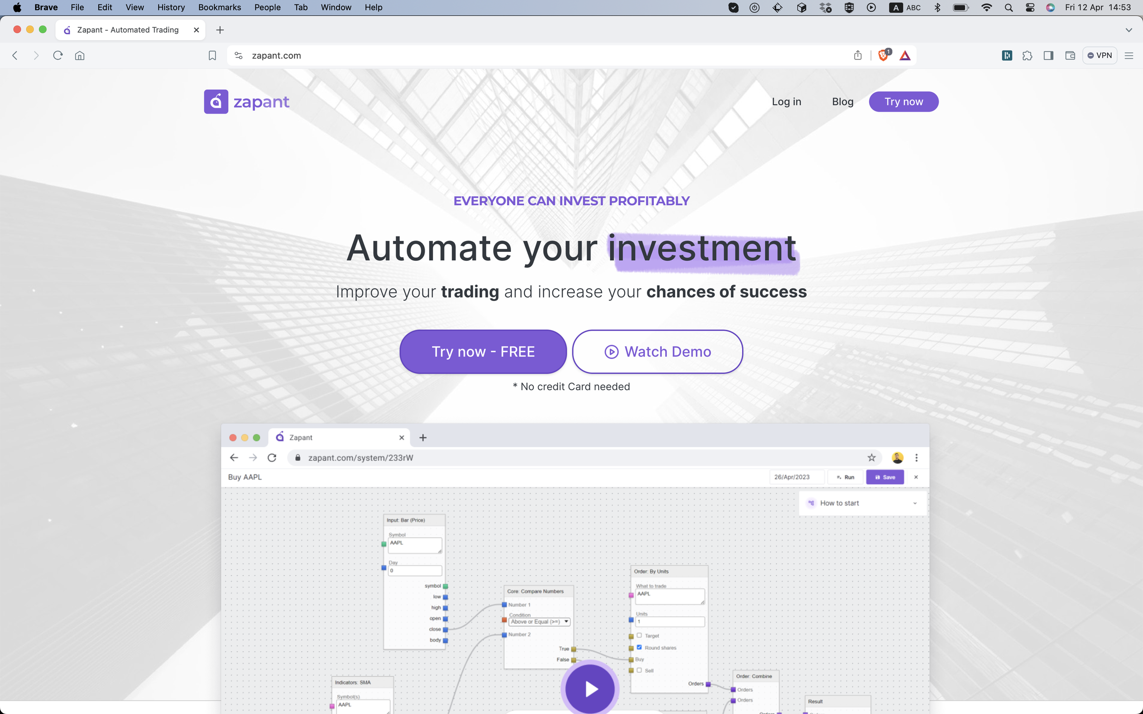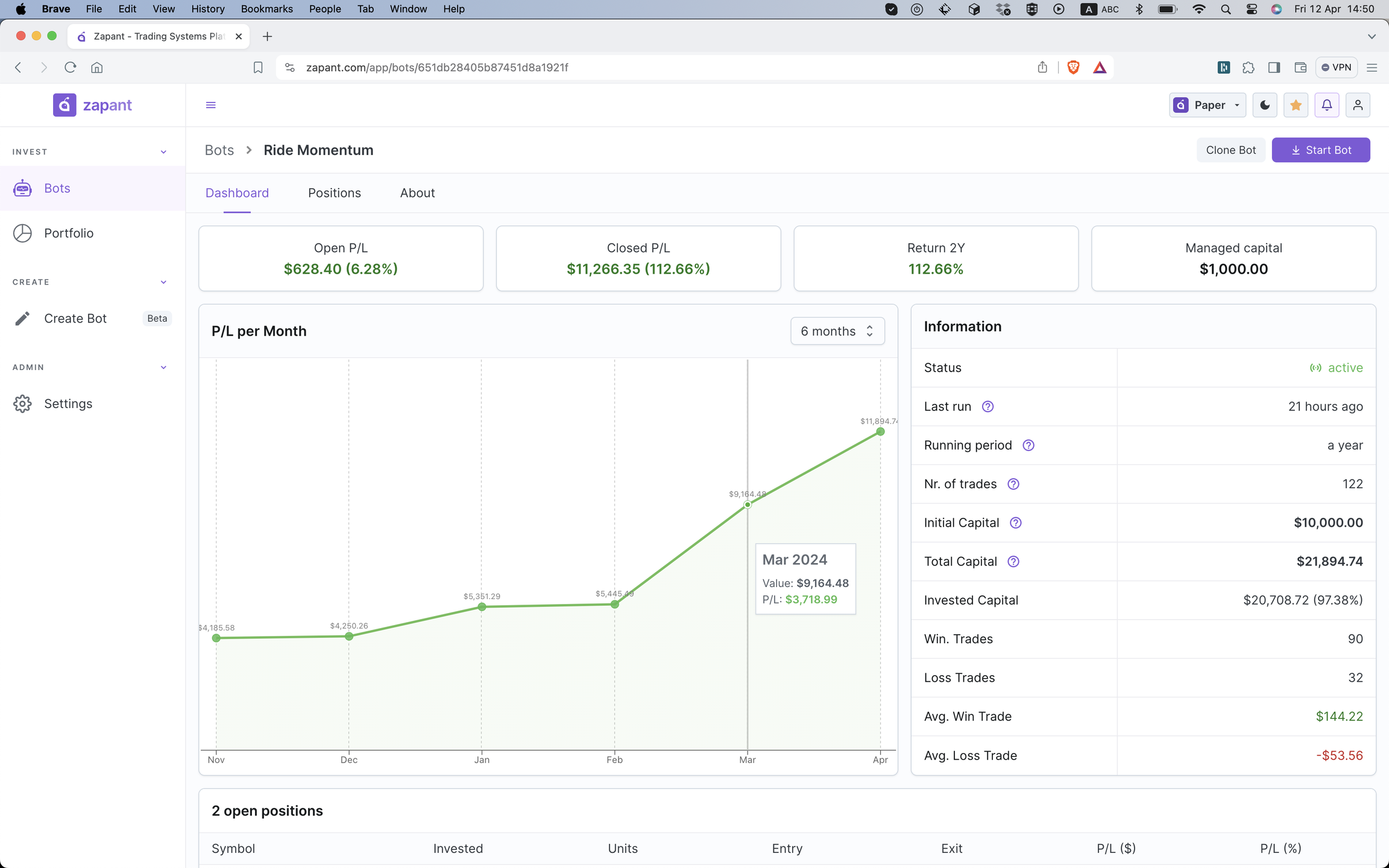 Zapant streamlines your investment journey by offering robust, automated bots for multiple assets that you can either create or replicate, catering to both stock and cryptocurrency markets. As an effective and intuitive trading platform, Zapant empowers traders of all experience levels to trade with assurance and ease. With its user-centric design, it fosters a supportive environment for both beginners and seasoned investors alike.