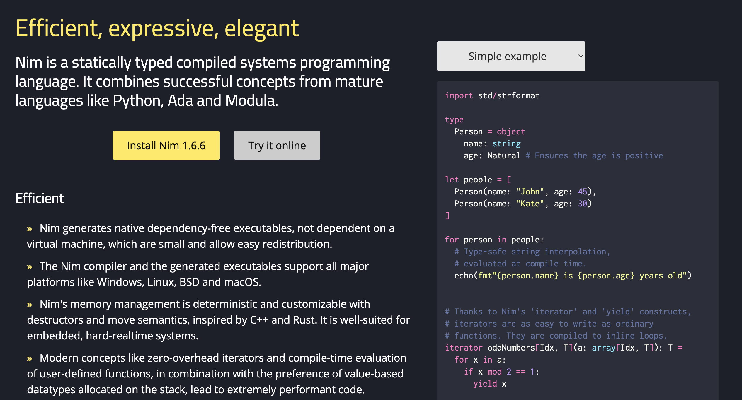 Nim is a systems programming language that is compiled and statically typed, drawing inspiration from well-regarded languages like Python, Ada, and Modula. It generates compact, native executables that do not rely on a virtual machine, facilitating straightforward distribution. With a memory management system that is both deterministic and customizable—incorporating destructors and move semantics reminiscent of C++ and Rust—Nim is especially adept for use in embedded systems and hard real-time applications. The language integrates contemporary features such as zero-overhead iterators and supports the compile-time evaluation of user-defined functions, which, alongside its focus on value-based data types allocated on the stack, leads to highly optimized code. Additionally, Nim offers flexibility by compiling to C, C++, or JavaScript, effectively catering to both backend and frontend needs. This multifaceted capability positions Nim as a compelling option for developers who prioritize both performance and user-friendliness in their coding projects. Ultimately, the combination of these features not only enhances productivity but also allows for innovative solutions in various programming contexts.