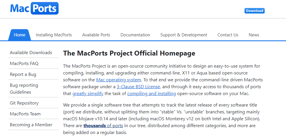 The MacPorts Project is a collaborative, open-source effort designed to provide an easily navigable platform for compiling, installing, and updating a wide range of open-source software—whether it be command-line, X11, or Aqua—on macOS systems. To support this initiative, we deliver the MacPorts software package, which functions through the command line and is distributed under a 3-Clause BSD License, allowing users straightforward access to thousands of ports that simplify the management of open-source software on their Mac devices. Our repository features a unified software tree that corresponds with the latest versions of each software title (port) available, thereby eliminating the challenges associated with distinguishing between “stable” and “unstable” versions, while prioritizing compatibility with macOS Mojave v10.14 and newer, including provisions for macOS Monterey v12 on both Intel and Apple Silicon architectures. With an extensive selection of ports spanning various categories, our collection is consistently growing to cater to user demands, and each release is crafted to improve the overall user experience, ensuring that the latest software choices are always within reach. This commitment to accessibility and usability fosters an environment where developers and users alike can thrive.
