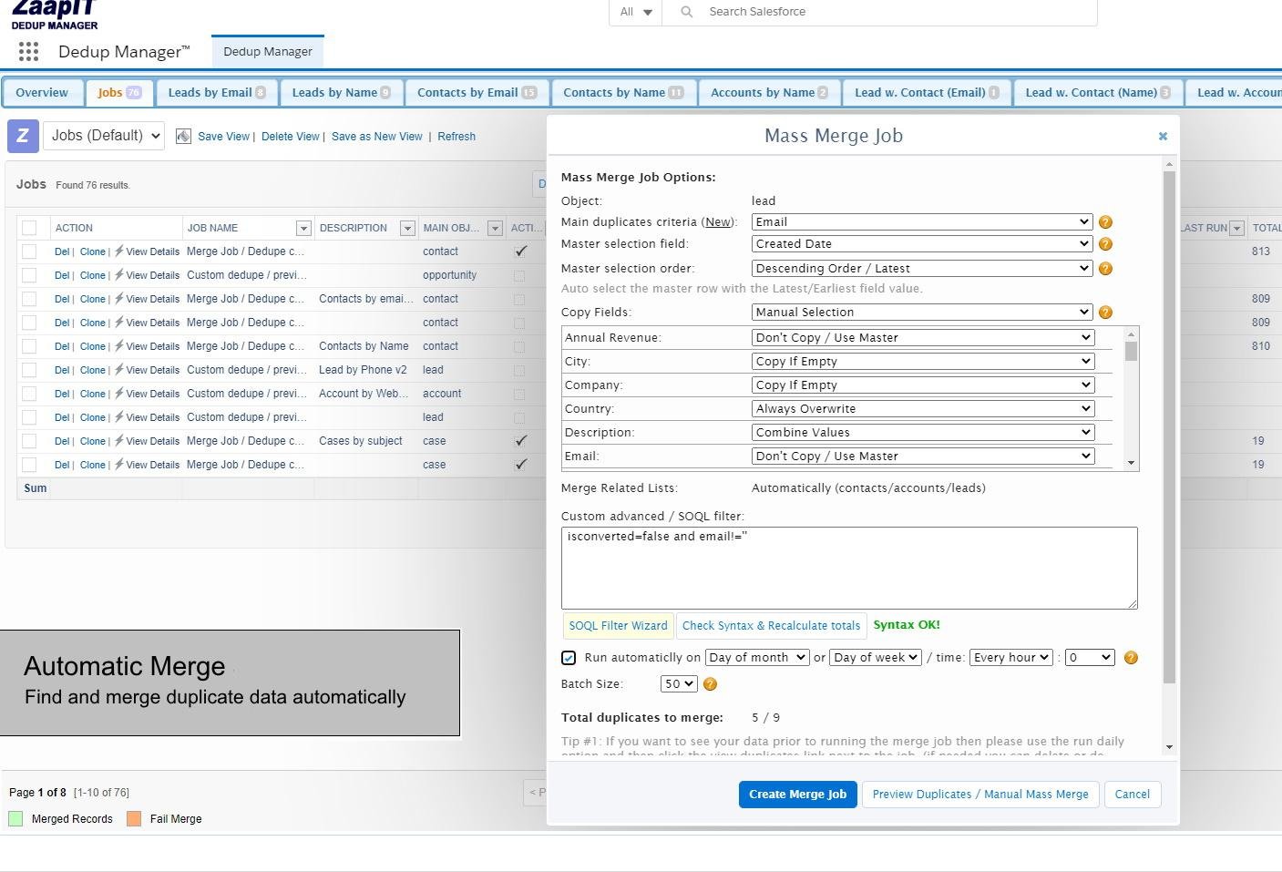 Automatically cleaning your data on a large scale helps eliminate duplicate records and reduces redundant tasks. With ZaapIT, both CRM administrators and advanced users can effortlessly cleanse duplicate entries, whether they belong to the same object or span across different objects. All it takes is configuring a set of rules, and the application will handle the data processing for you, streamlining your workflow and enhancing data integrity. This not only saves time but also ensures that your database remains organized and efficient.
