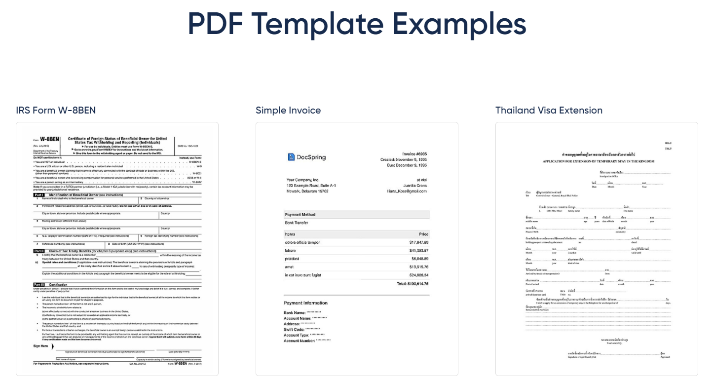 DocSpring streamlines the PDF creation and completion process for developers, making it effortless and efficient. It features an intuitive visual PDF template editor paired with a PDF filling API that allows users to populate PDFs with a simple API request. When a PDF template is uploaded, the system automatically imports fields if the document contains fillable forms, which greatly simplifies initial setup. With a convenient drag-and-drop interface in our visual template editor, developers can effortlessly organize their fields and tailor their characteristics, conditions, and presentation options. After setting up their templates, generating a finalized PDF is as easy as sending a straightforward POST request, needing only a few lines of code. The platform guarantees that the data transmitted through API requests aligns perfectly with the corresponding fields in the PDF templates, thus reducing the chances of errors or data loss. Supporting a diverse range of field types, including barcodes, QR codes, images, and signatures, DocSpring offers robust form completion and signing features. Furthermore, users have the ability to construct web-based forms directly from the fields embedded in their PDF templates, expanding the opportunities for digital engagement. This adaptability makes DocSpring an essential resource for any developer looking to improve their PDF management and interaction capabilities significantly. Ultimately, its user-friendly design and powerful features ensure that developers can focus on building innovative solutions without getting bogged down in complex PDF handling processes.