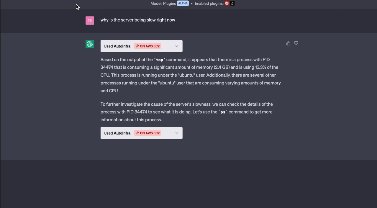 Interact with your servers by employing countless command line tools using natural language commands for seamless integration. When you install the OpenAI plugin via plugin autoinfra, you unlock the potential to execute dynamic code adjustments based on your infrastructure's performance. This configuration supports real-time tracking and evaluation of key metrics such as CPU load, memory usage, network traffic, and other vital indicators. In addition, it streamlines operations for machine learning infrastructure, quality assurance testing, and server performance diagnostics. Moreover, it enhances your workflow with in-depth error analysis, prompt issue resolution, and organized code refactoring aimed at improving overall system efficiency. By leveraging these functions, you can maintain optimal performance and reliability across your systems while also adapting to changing demands in your infrastructure. Ultimately, this comprehensive approach empowers you to achieve a more robust and agile operational environment.
