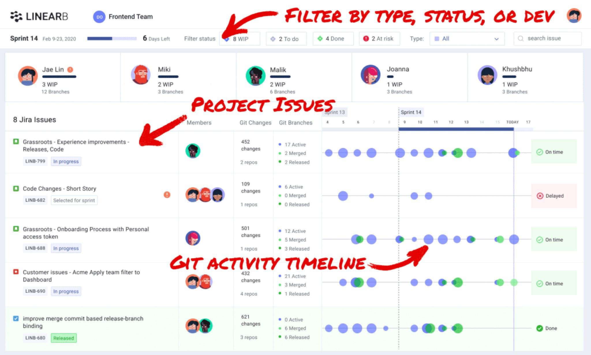 We integrate and reformulate data from Git, releases, and projects to deliver instantaneous insights into project progress and team performance without requiring any manual interventions from developers.