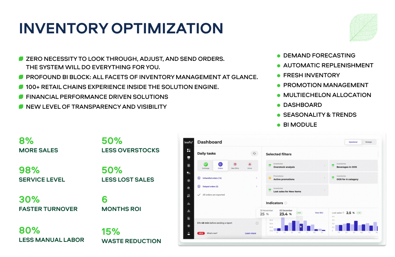 With a focus on enhancing financial performance, LEAFIO leverages self-regulating AI technologies to ensure precise orders, drive sales growth, improve inventory turnover, and reduce waste. The system is designed to automate all necessary processes for you.