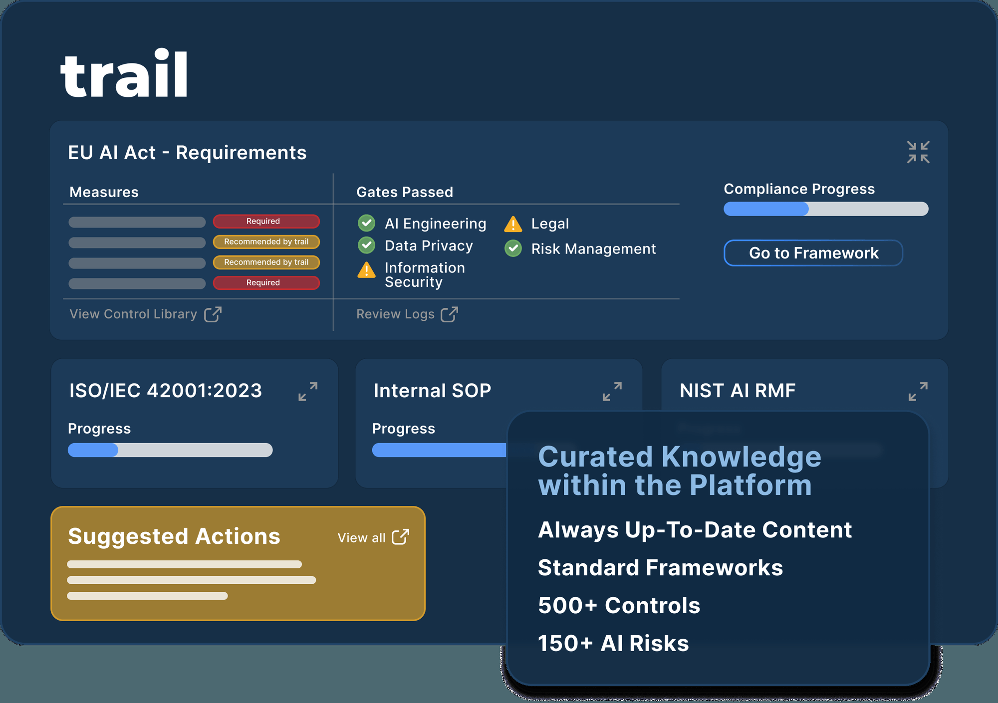 Trail ML acts as a copilot platform for AI governance, aimed at helping organizations create dependable, compliant, and transparent AI systems by automating the cumbersome tasks associated with governance and documentation. The platform integrates a wide range of critical functionalities, including management of AI registries, policy development, risk evaluation, automated documentation processes, oversight of development, audit trails, and compliance workflows, all within a unified system. This allows teams to efficiently organize and oversee all AI applications, track decisions from the initial stages of data and model development to final results, and significantly reduce the workload associated with manual documentation and governance responsibilities. Furthermore, Trail ML encompasses various governance frameworks and templates, encourages the formulation of customized AI policies, and supports teams in identifying and mitigating risks while preparing for audits and meeting standards such as ISO 42001 and regulations like the EU AI Act. By leveraging a blend of curated knowledge, risk libraries, and AI-powered automation, the platform facilitates the management of governance duties, transforms regulatory requirements into actionable steps, and promotes collaboration among stakeholders. This ultimately leads to a more streamlined governance environment, allowing organizations to prioritize innovation over compliance challenges. As a result, teams can allocate more resources to creative initiatives while maintaining adherence to necessary regulations.