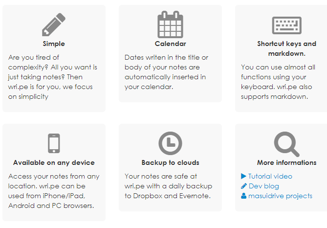 wri.pe is a user-friendly web notepad tailored for individuals who value simplicity and ease of use. For those who want to take notes with minimal hassle, wri.pe stands out as an excellent option, focusing on a seamless and accessible experience. By incorporating dates within the titles or contents of your notes, it automatically syncs with your calendar, ensuring everything is organized. Most features are conveniently reachable through keyboard shortcuts, which boosts productivity significantly. The platform also accommodates markdown formatting, allowing users to create aesthetically pleasing notes without much effort. You can access your notes from various devices, including iPhones, iPads, Android gadgets, or any internet browser on a computer. Your information is safeguarded with daily backups to both Dropbox and Evernote, providing you with added reassurance. In addition to its online capabilities, wri.pe supports HTML5 offline functionality, which means you can continue working even without internet access. You also have the flexibility to either publish your notes for public viewing or keep them private, accessible only to your friends. The collaborative tools in wri.pe mirror those found in Git, offering fork and pull-request features to streamline teamwork. With a blend of keyboard shortcuts and markdown support, wri.pe ensures that your notes are not only well-organized but also safely stored in the cloud, making it an indispensable resource for anyone who frequently takes notes. Its straightforward design and robust features cater to both individual users and collaborative efforts alike, further enhancing its appeal.