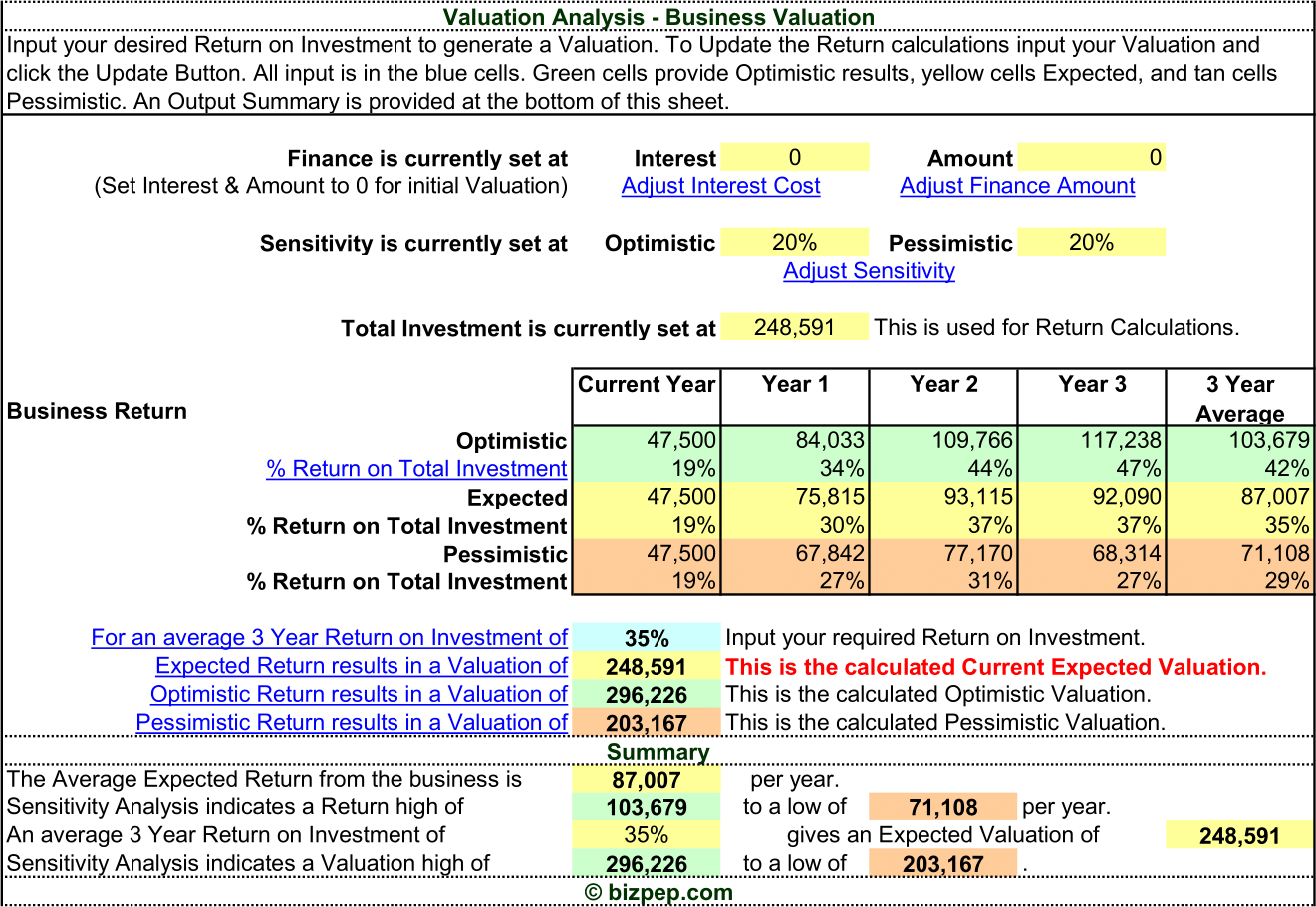 Business Valuation offers a cost-effective, efficient, and accurate means of assessing a company's worth. This process integrates comparative metrics for anticipated performance alongside fundamental financial information, such as revenue and both variable and fixed costs, to determine a business's value. By leveraging your unique insights into the business and market dynamics, a three-year performance projection is generated, which includes sensitivity analysis, expected investment returns, and an overall business valuation. The approach is streamlined, user-friendly, and demands only a limited amount of input. This makes it accessible for various stakeholders looking to understand the financial landscape of their enterprise.