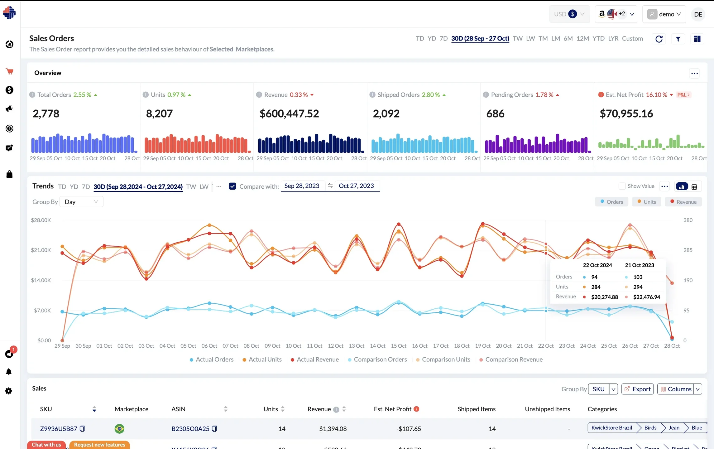 SellerMagnet’s profit dashboard gives you an overview of orders, costs, returns, and real-time inventory across all connected marketplaces. It’s built to help you understand performance at both product and portfolio level.