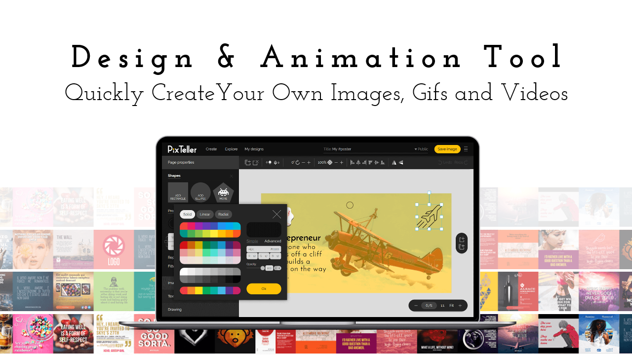 The PixTeller Editor enables users to quickly create, download, share, and adjust personalized graphics, animations, and social media images.