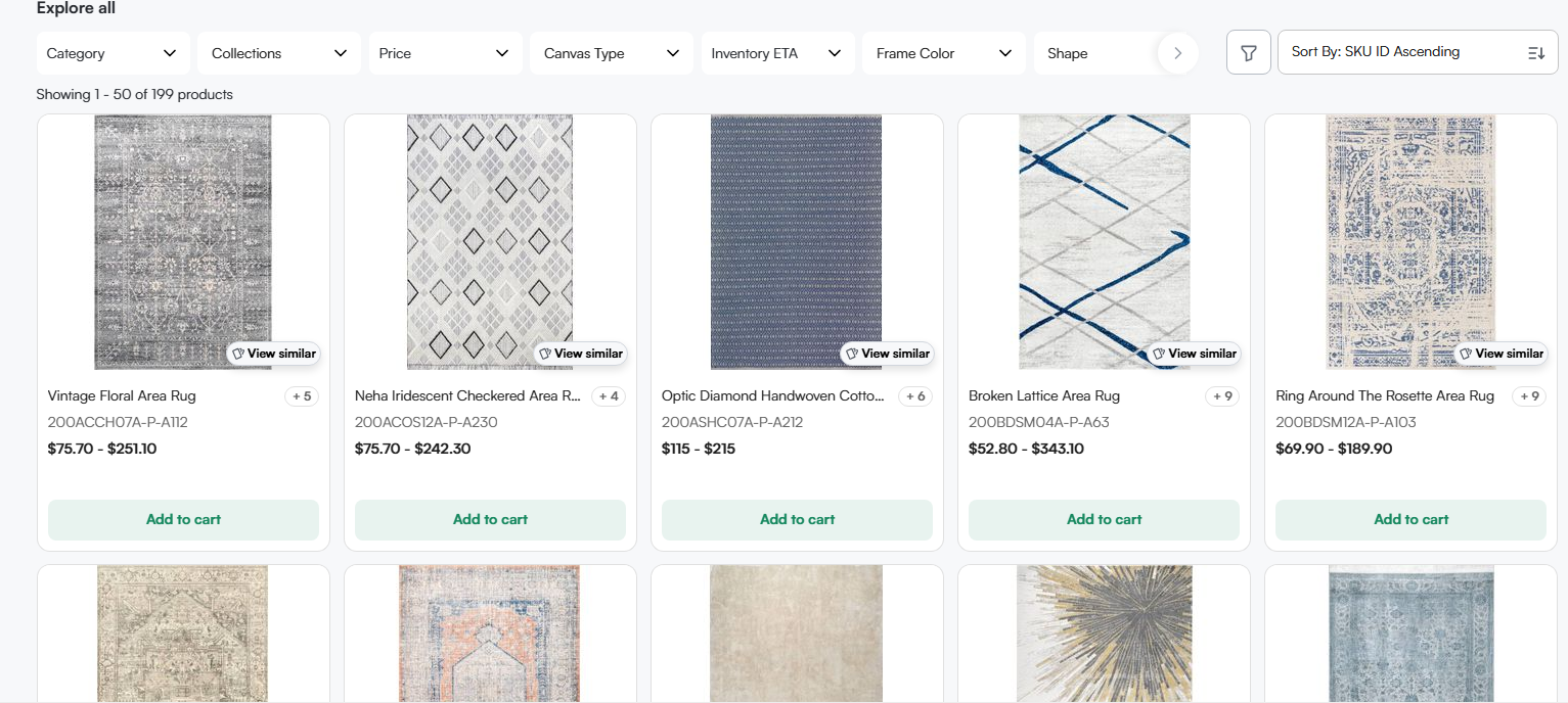 Dashboard- Features categories and collections + AI-driven recommendations based on customers’ previous purchases and buying patterns + Typo-tolerant search bar that searches for any given search across SKUs, attributes, and names, even if spelled wrong.