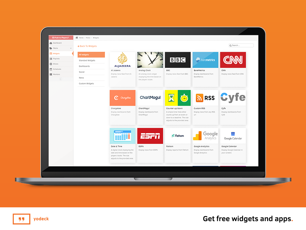 Creating, scheduling, and designing content is a breeze with Yodeck's web-based tools. To effectively communicate with your key demographics, you can utilize eye-catching media such as videos, images, PDFs, Office documents, data dashboards, and social media feeds.